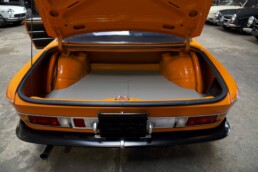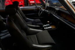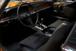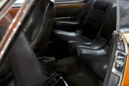 L’instrumentation intérieure, y compris le volant original à trois branches recouvert de cuir, est d’origine et en parfait état. À l’intérieur, les sièges restaurés en cuir noir avec tissu assorti se distinguent, tout comme les panneaux de porte récemment restaurés. Le sol de l’habitacle est également doté de moquettes et de tapis neufs.