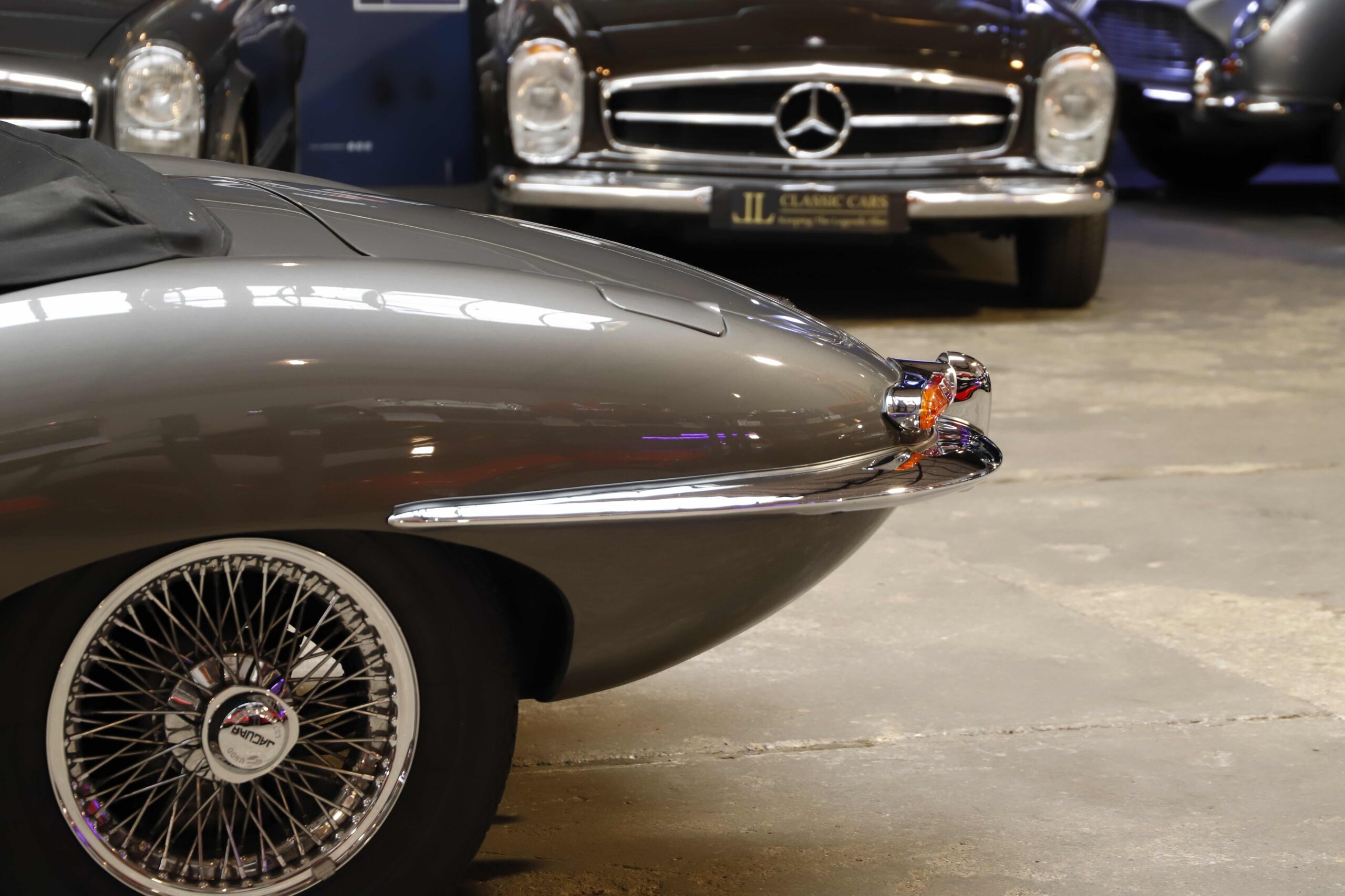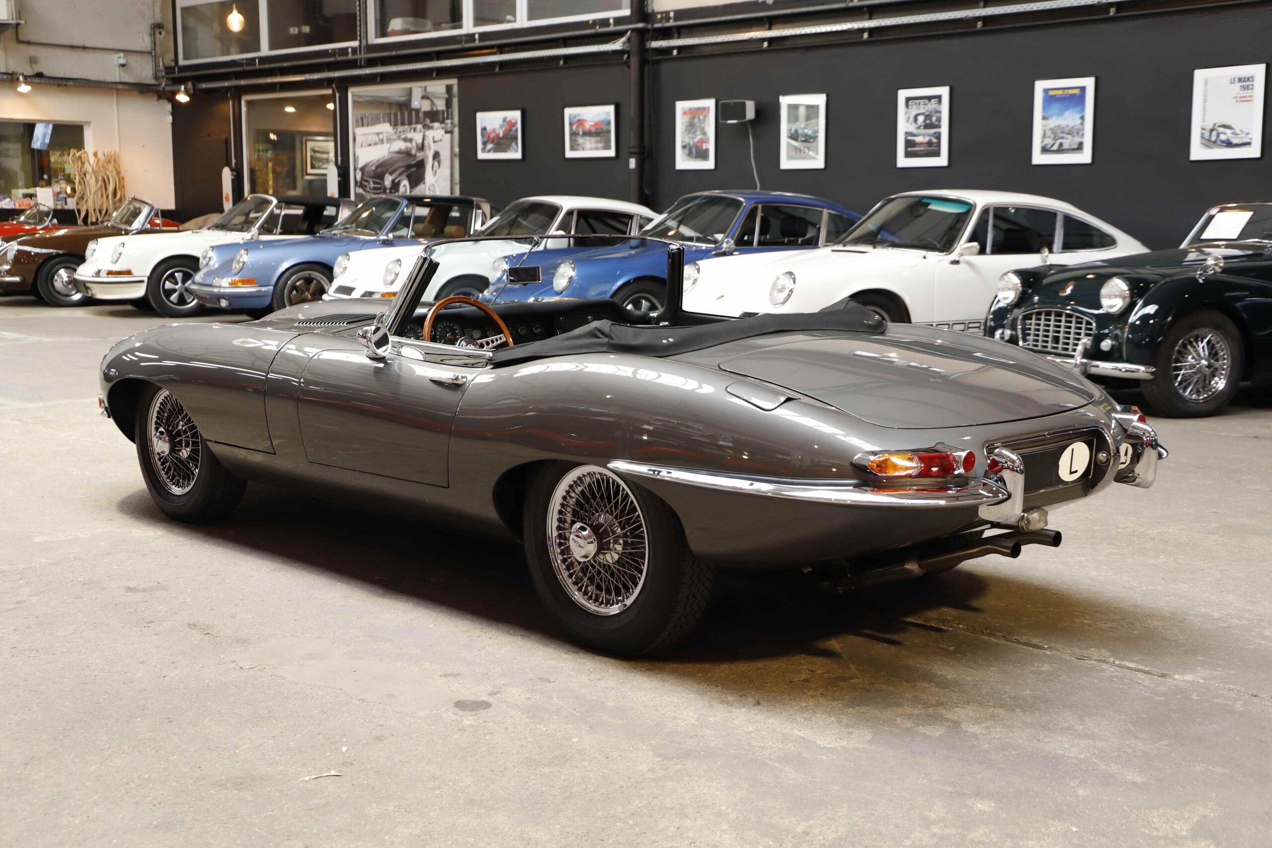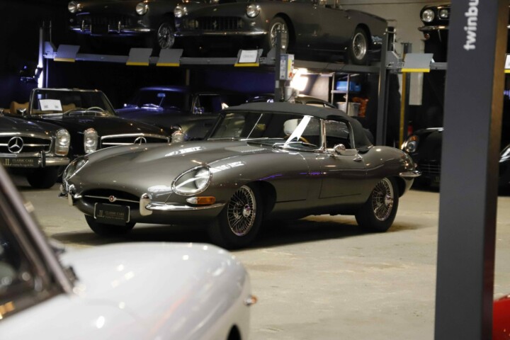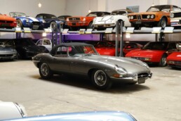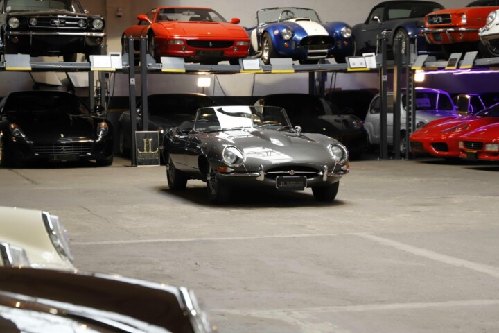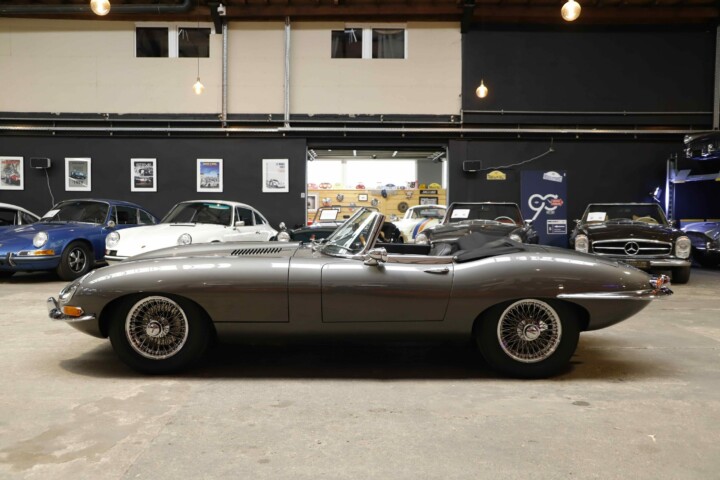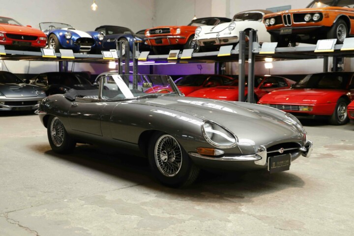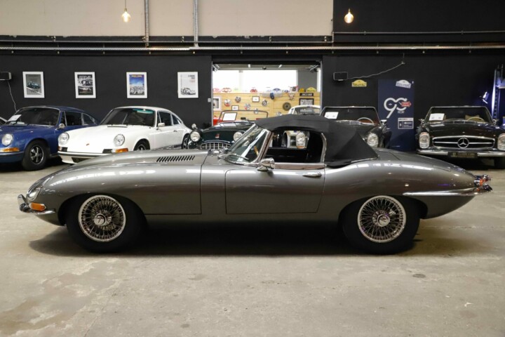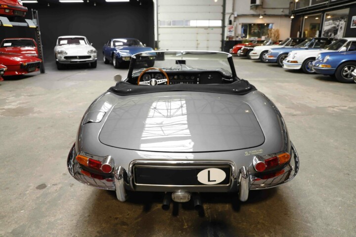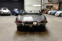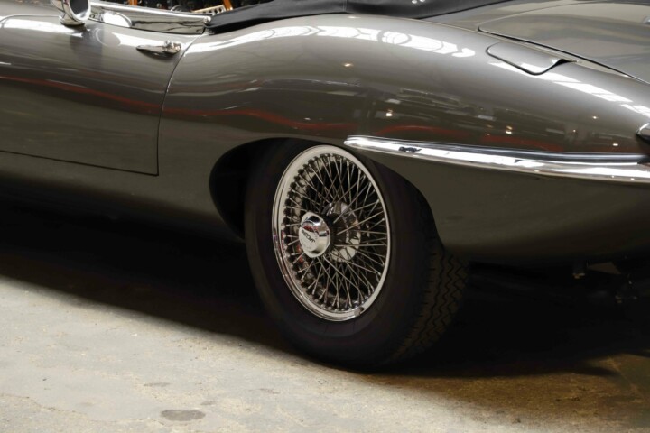 La Jaguar Type E Série 1/2 4.2L présentée ici incarne l’élégance absolue du grand tourisme britannique. Cet exemplaire a bénéficié d’une restauration intégrale. La carrosserie a été entièrement démontée, redressée et ajustée avec une précision remarquable. Chaque panneau a été préparé minutieusement afin d’obtenir des lignes parfaitement nettes. La voiture a ensuite reçu sa nouvelle teinte Gun Metal, appliquée selon un procédé haut de gamme pour garantir profondeur et uniformité. Les éléments chromés ont été rénovés ou remplacés afin de retrouver leur éclat d’origine.
