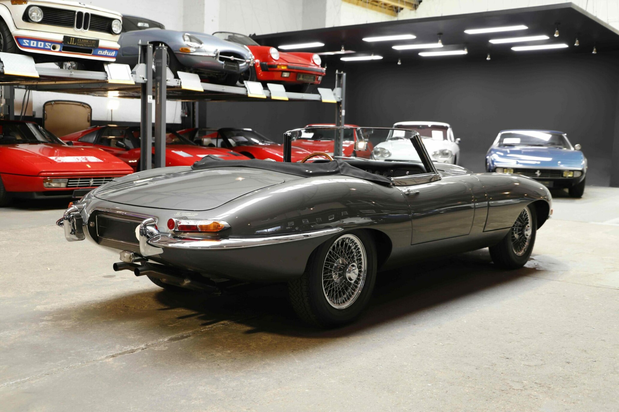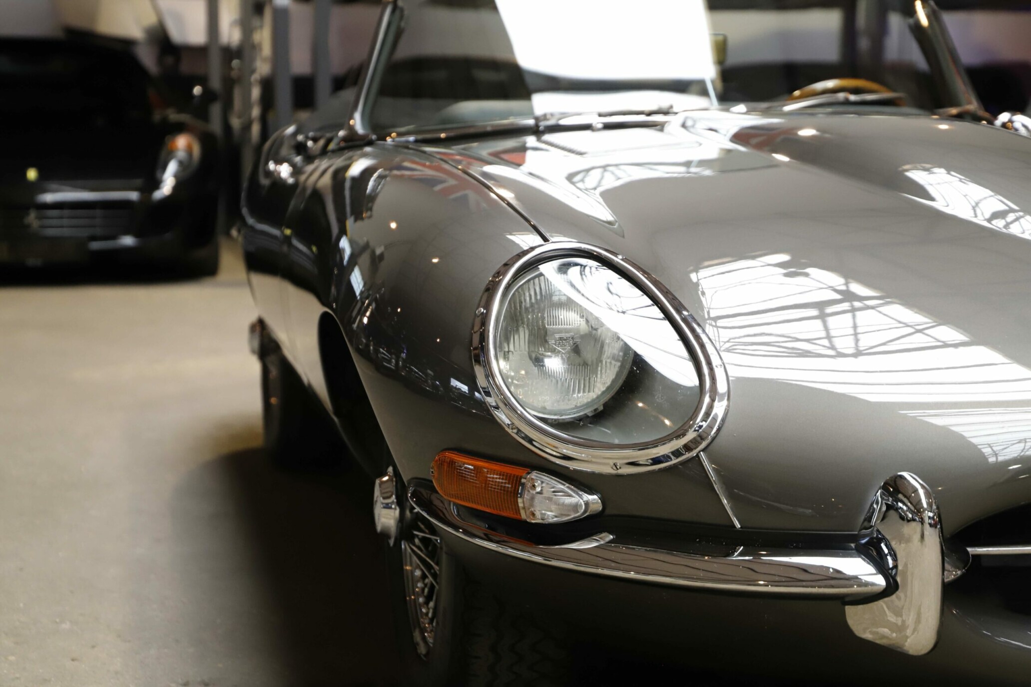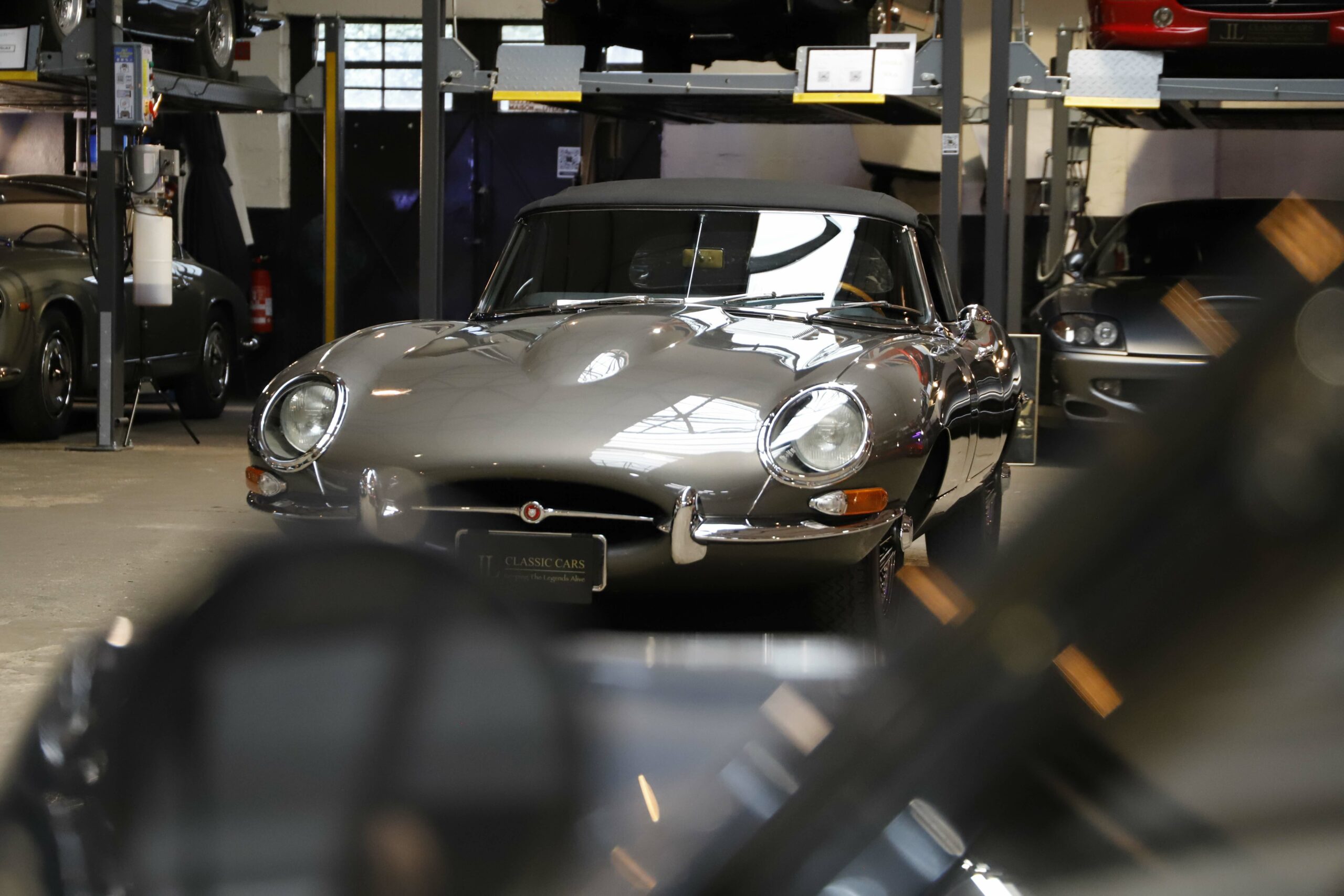 La Jaguar Type E Série 1/2 4.2L présentée ici incarne l’élégance absolue du grand tourisme britannique. Cet exemplaire a bénéficié d’une restauration intégrale. La carrosserie a été entièrement démontée, redressée et ajustée avec une précision remarquable. Chaque panneau a été préparé minutieusement afin d’obtenir des lignes parfaitement nettes. La voiture a ensuite reçu sa nouvelle teinte Gun Metal, appliquée selon un procédé haut de gamme pour garantir profondeur et uniformité. Les éléments chromés ont été rénovés ou remplacés afin de retrouver leur éclat d’origine.