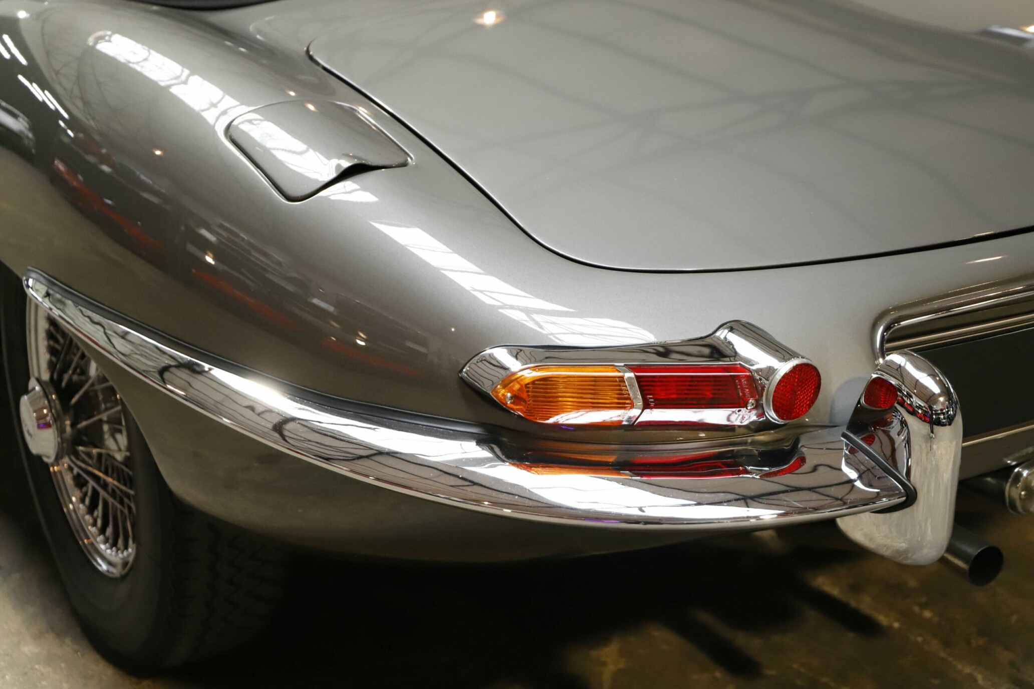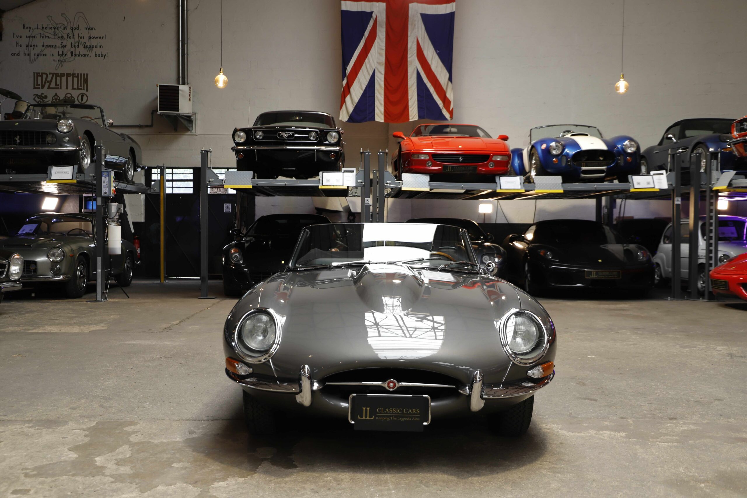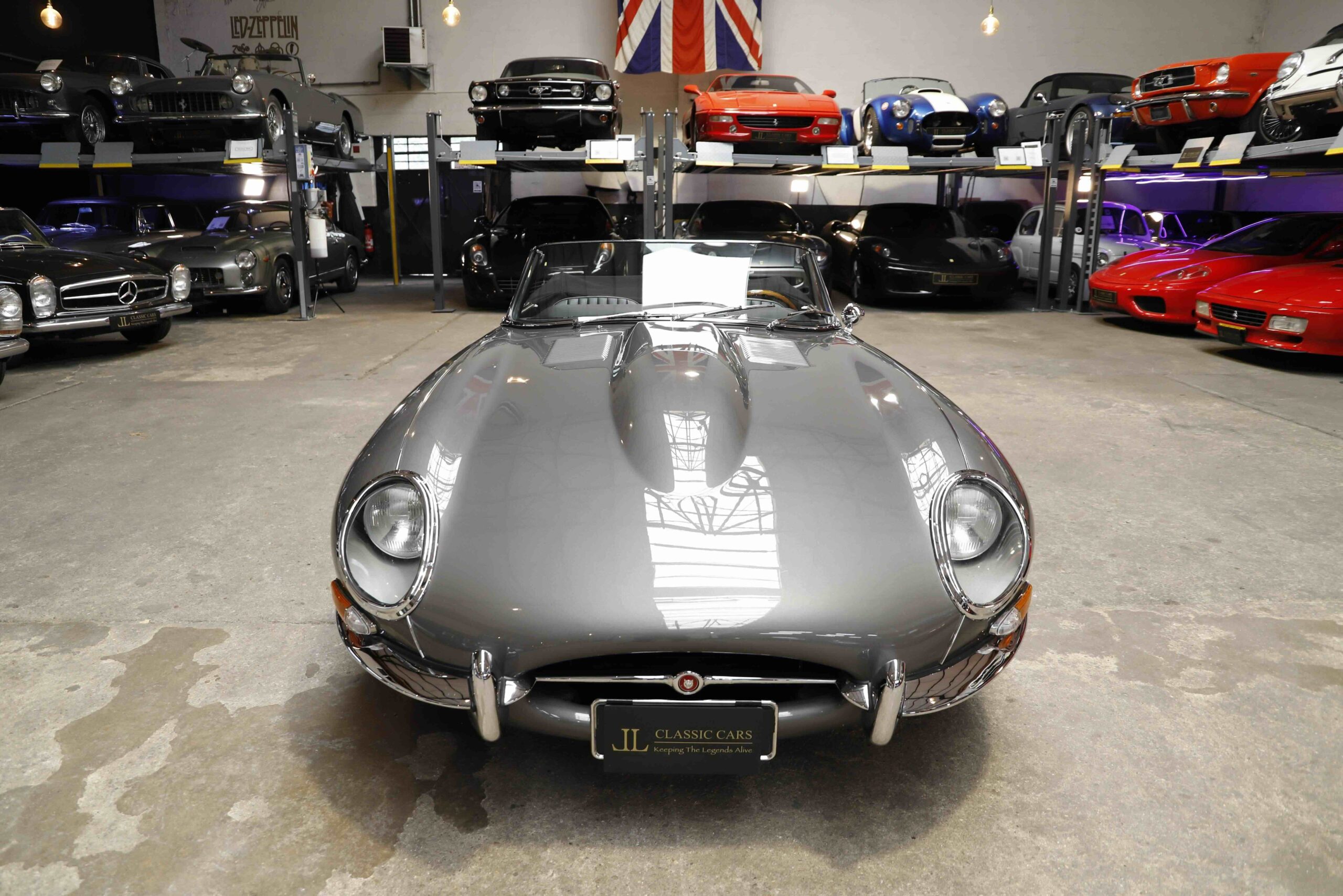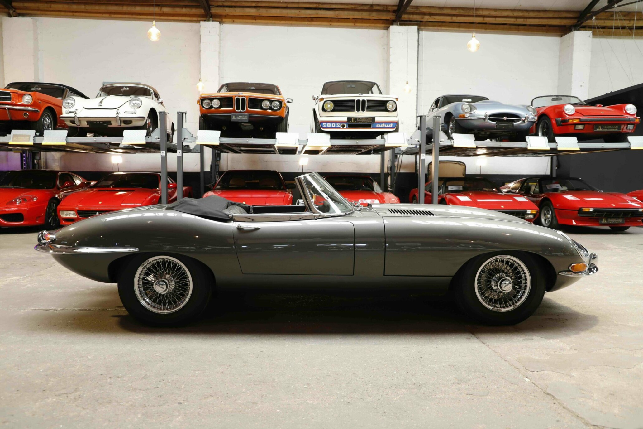 La Jaguar Type E Série 1/2 4.2L présentée ici incarne l’élégance absolue du grand tourisme britannique. Cet exemplaire a bénéficié d’une restauration intégrale. La carrosserie a été entièrement démontée, redressée et ajustée avec une précision remarquable. Chaque panneau a été préparé minutieusement afin d’obtenir des lignes parfaitement nettes. La voiture a ensuite reçu sa nouvelle teinte Gun Metal, appliquée selon un procédé haut de gamme pour garantir profondeur et uniformité. Les éléments chromés ont été rénovés ou remplacés afin de retrouver leur éclat d’origine.