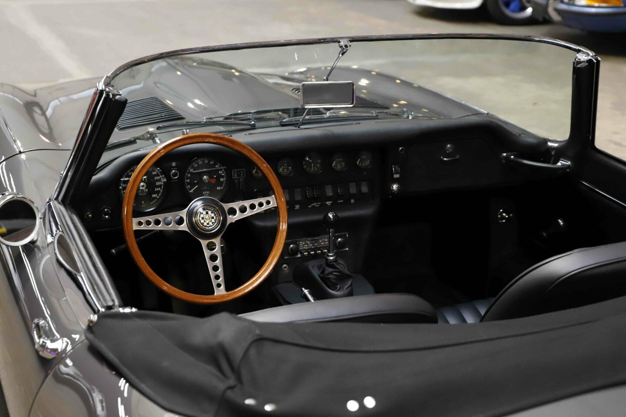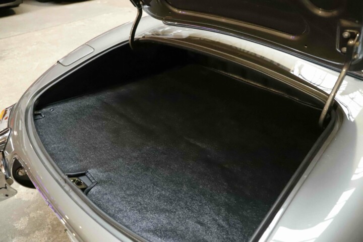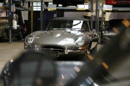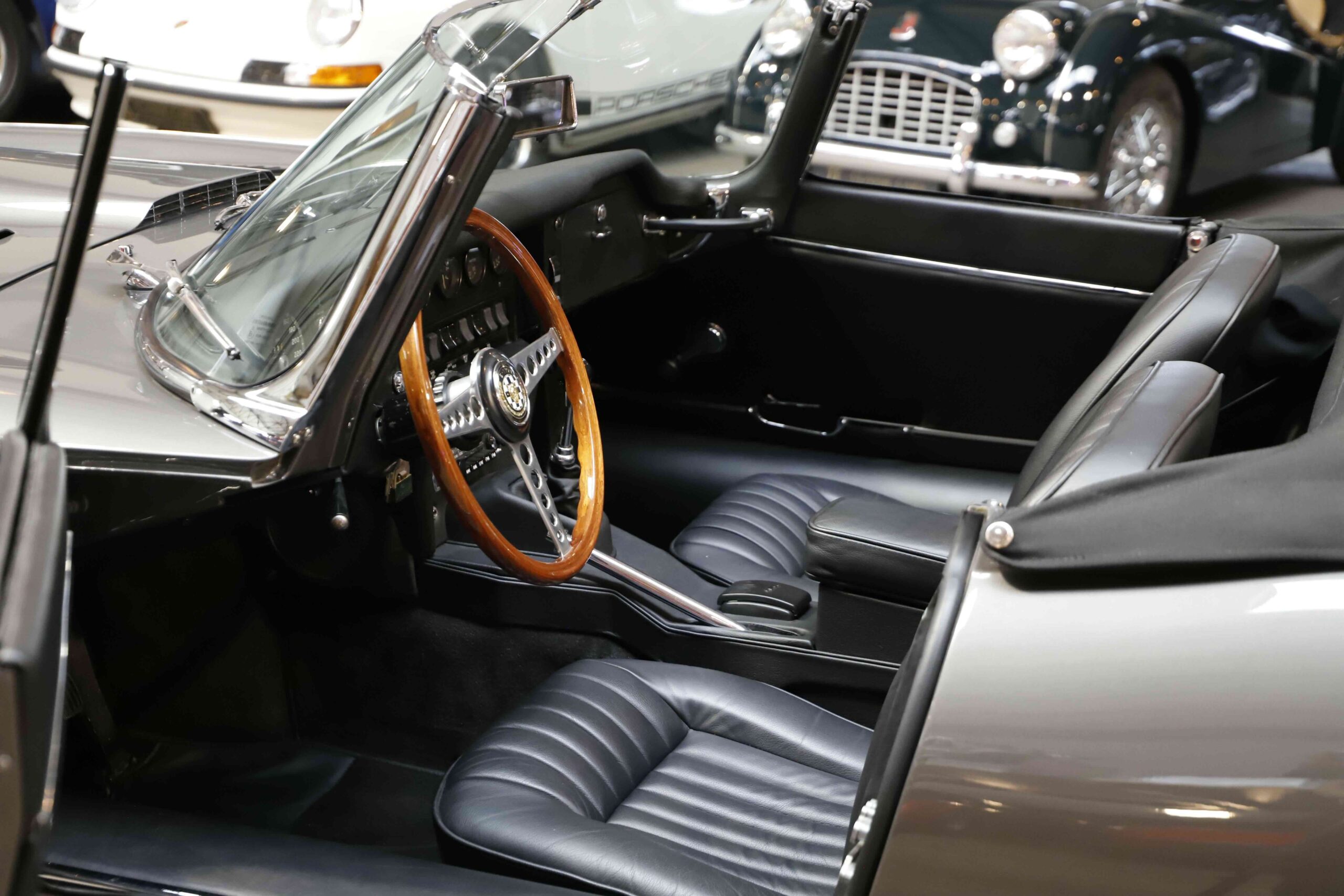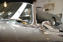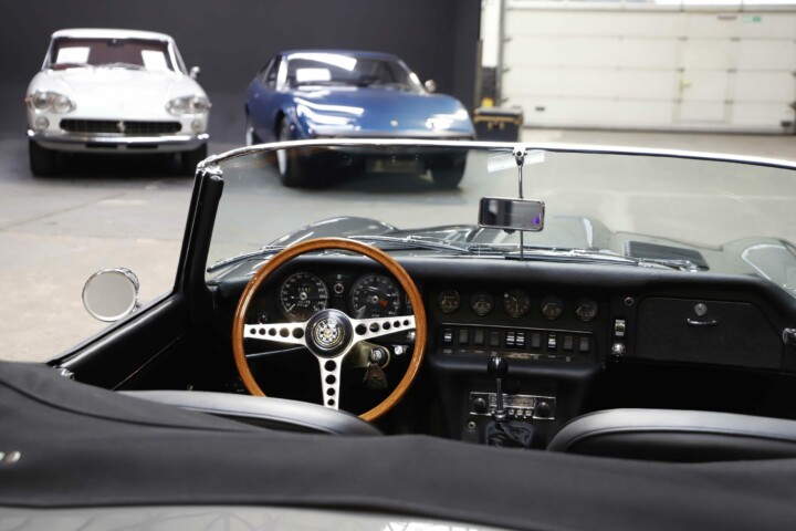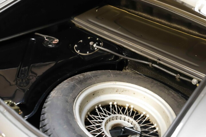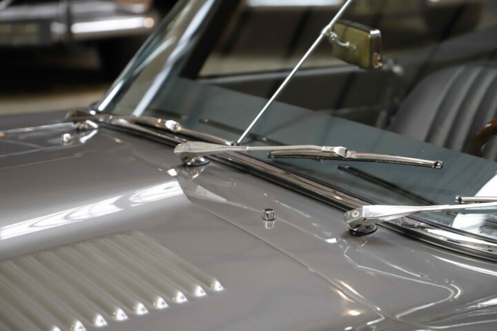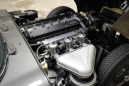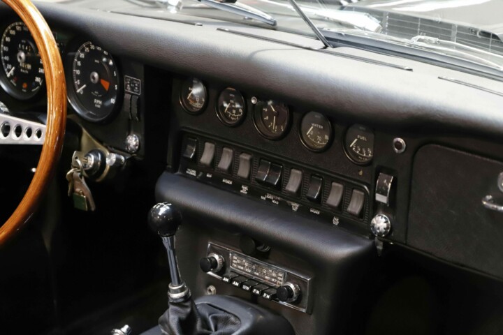 L’habitacle a fait l’objet d’un travail tout aussi soigné, avec une sellerie entièrement refaite. Le cuir, les moquettes et les garnitures ont été réalisés dans des matériaux conformes à l’origine. Le tableau de bord a été restauré avec ses instruments d’époque parfaitement fonctionnels. Le volant en bois et les détails intérieurs rappellent le charme classique du modèle. Chaque élément contribue à recréer l’ambiance unique de la Type E des années soixante. L’ajustement des portes, capots et vitrages a été peaufiné pour garantir une présentation exemplaire.