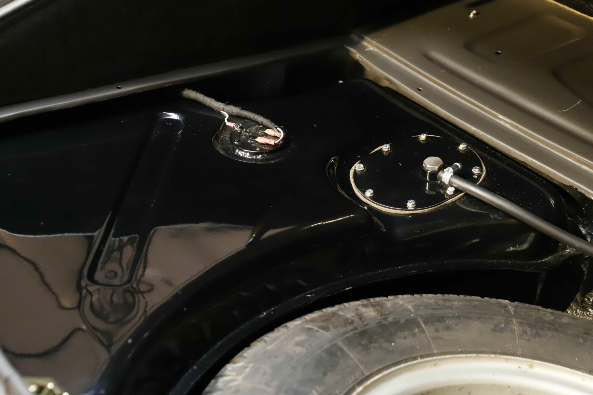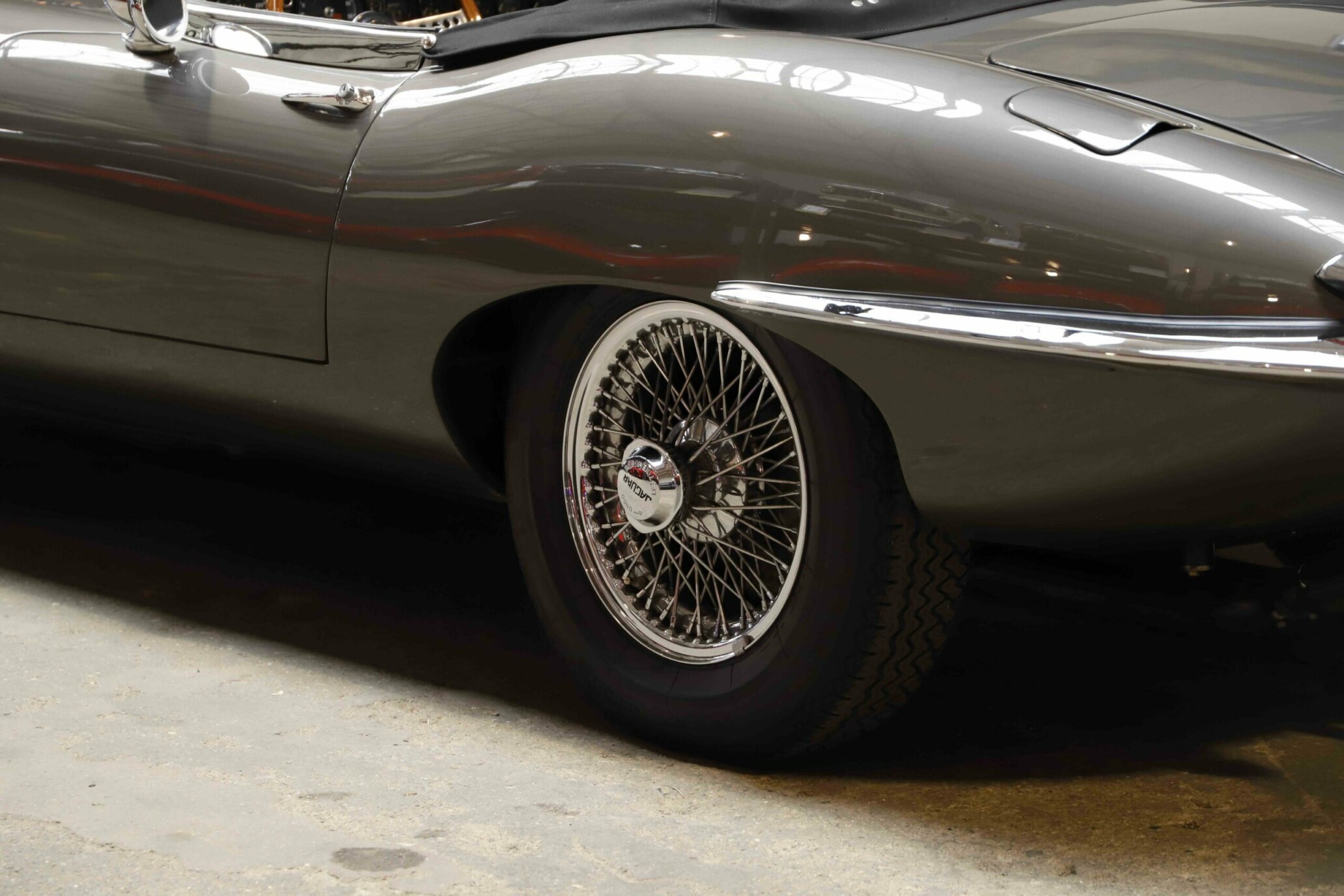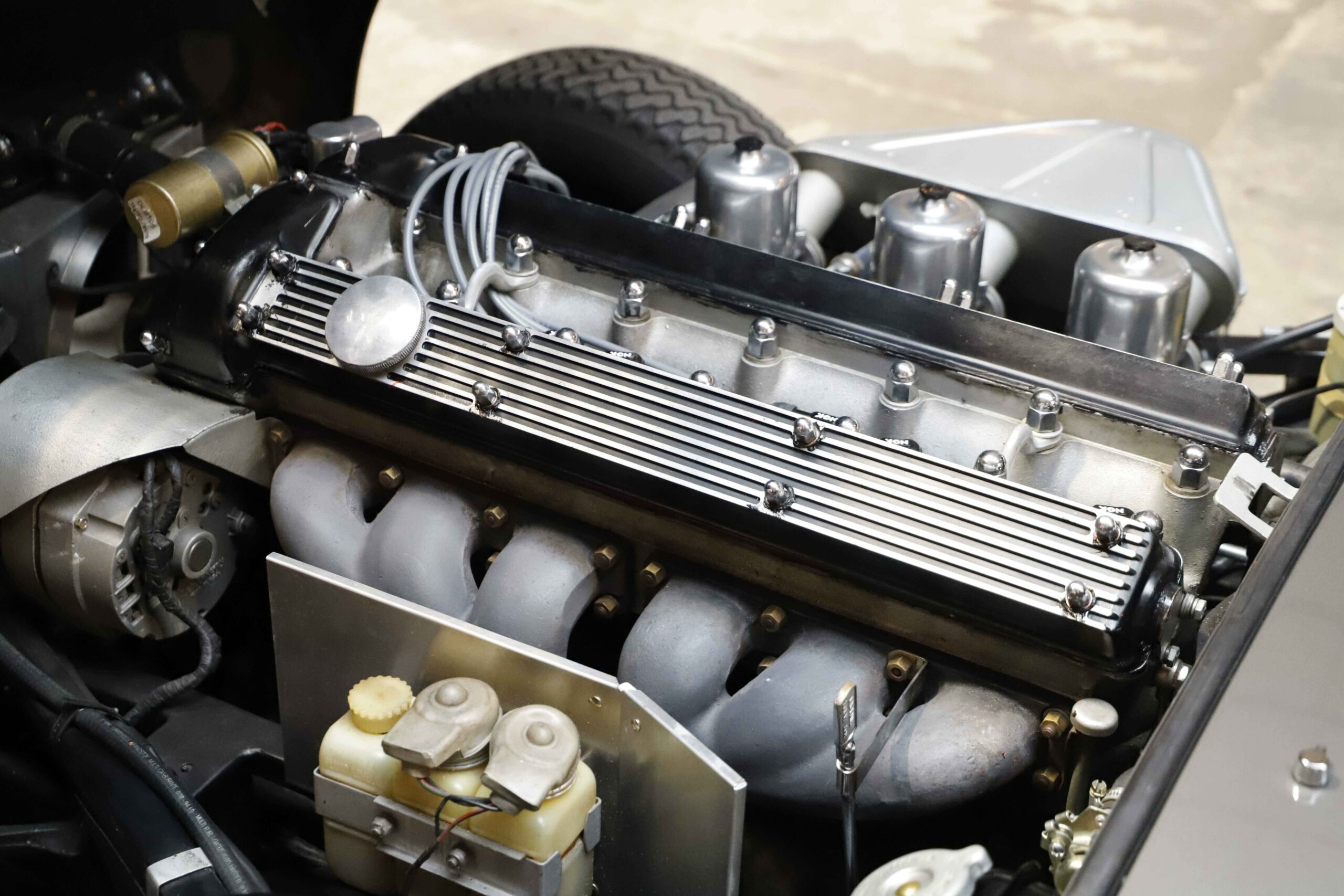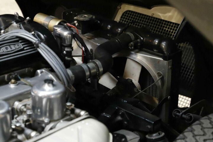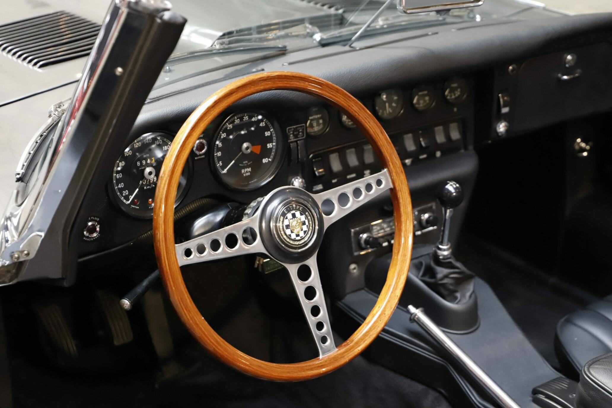 L’habitacle a fait l’objet d’un travail tout aussi soigné, avec une sellerie entièrement refaite. Le cuir, les moquettes et les garnitures ont été réalisés dans des matériaux conformes à l’origine. Le tableau de bord a été restauré avec ses instruments d’époque parfaitement fonctionnels. Le volant en bois et les détails intérieurs rappellent le charme classique du modèle. Chaque élément contribue à recréer l’ambiance unique de la Type E des années soixante. L’ajustement des portes, capots et vitrages a été peaufiné pour garantir une présentation exemplaire.