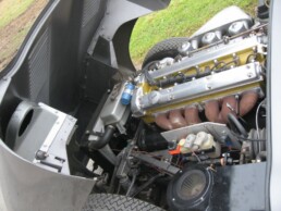 A l’origine, la Jaguar Type E était le successeur designé de la voiture sport de course Type D et était destinée aux circuits. Mais au Salon de Genève de mars 1961, elle fut présentée sous l’apparence de complet-veston. Les constructeurs ont concentrés leurs efforts sur des points déjà incorporés à la Type D et ont rejeté toute suggestion visant à modeler la voiture selon les modes de l’époque et même des considérations pragmatiques ont pris une place secondaire dans la création de l’extraordinaire forme de la voiture. Volant attrayant, construit en jante de bois à trois rayons. Les roues motrices sont indépendamment suspendues aux arbres de longueur fixe avec des bras inférieurs triangulaire, une barre stabilisatrice et 4 ressorts hélicoïdaux.